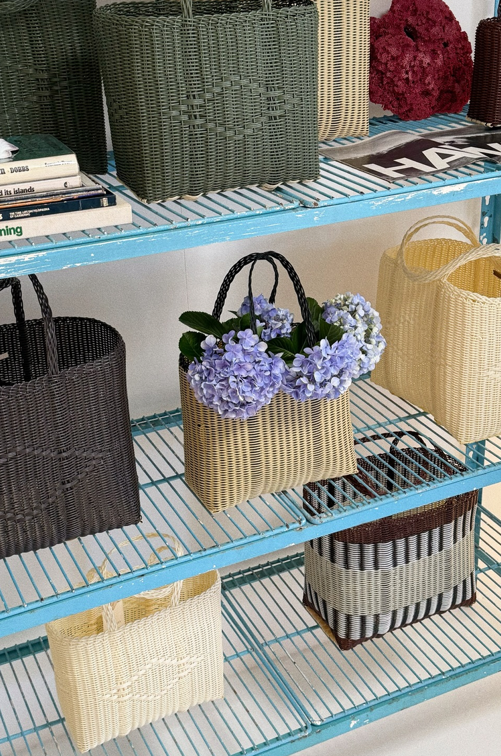 Handwoven from recycled plastic (polyethylene HDPE), from Palorosa's tote bag collection the 'Basket Tote Bag' features a woven diamond pattern. Unlined, hand-sewn leather brand tag with a cream woven bottom.